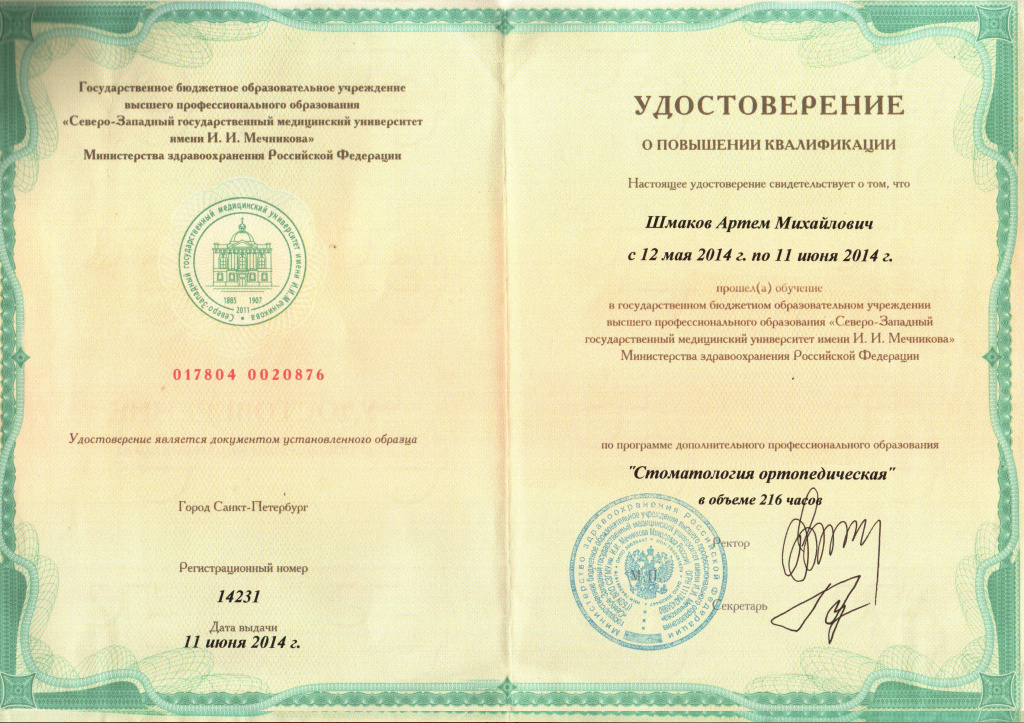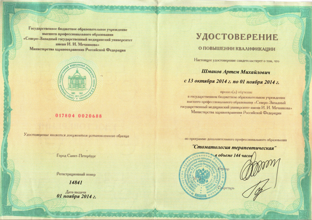 — Повышение квалификации в Северо-Западном государственном медицинском университете им. И.И. Мечникова по специальности «Стоматология терапевтическая» , «Стоматология ортопедическая» 2014г.
