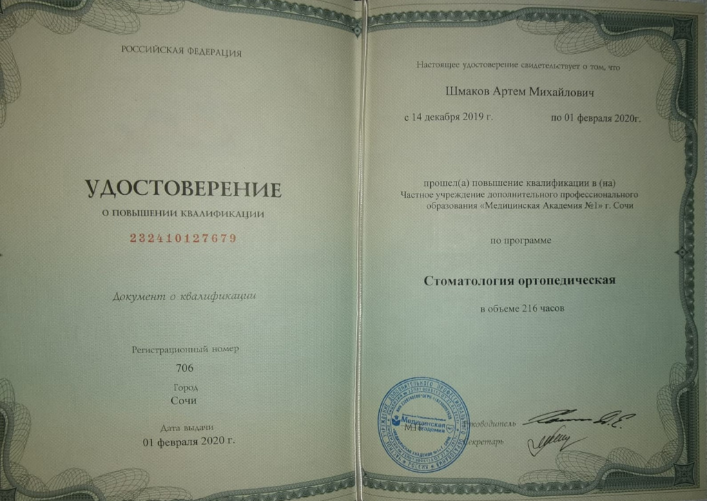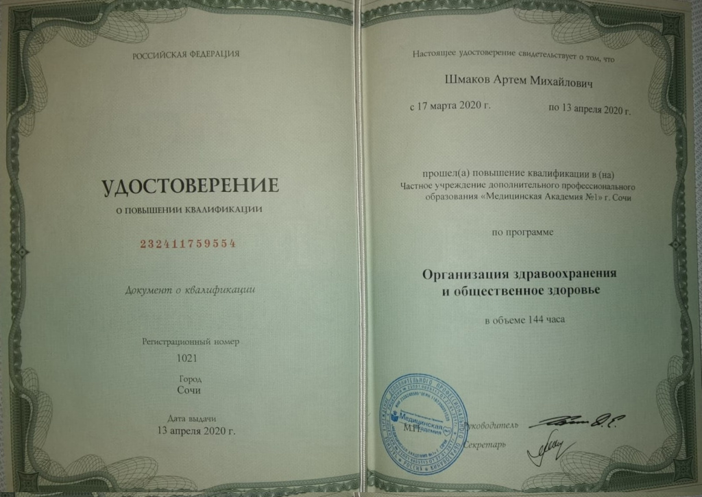 — Повышение квалификации в частном учреждении дополнительного профессионального образования «Медицинская Академия №1» по специальности «Стоматология хирургическая», «Стоматология ортопедическая», «Организация здравоохранения и общественное здоровье» 2020г.