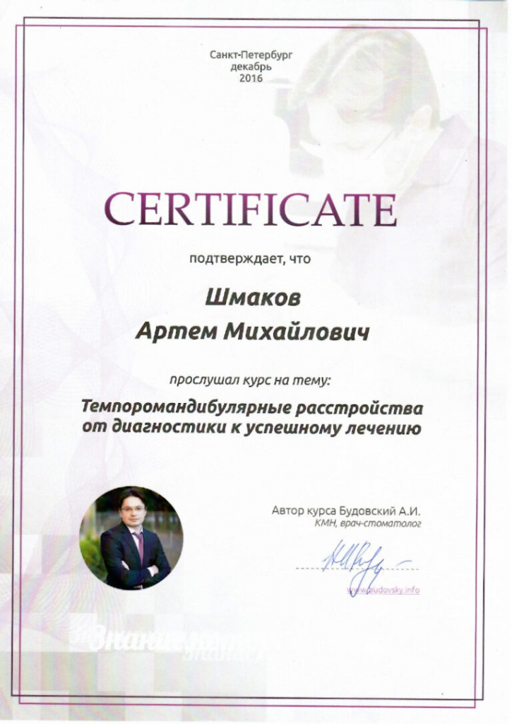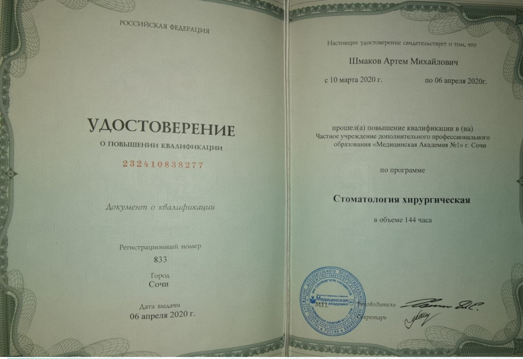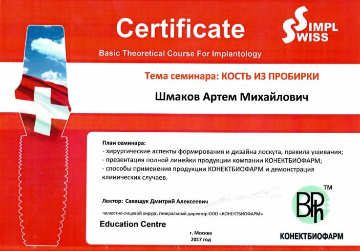 — Повышение квалификации в ООО «НовоНексус» по программе: «Дентальная имплантация в сложных клинических случаях» 2020г.