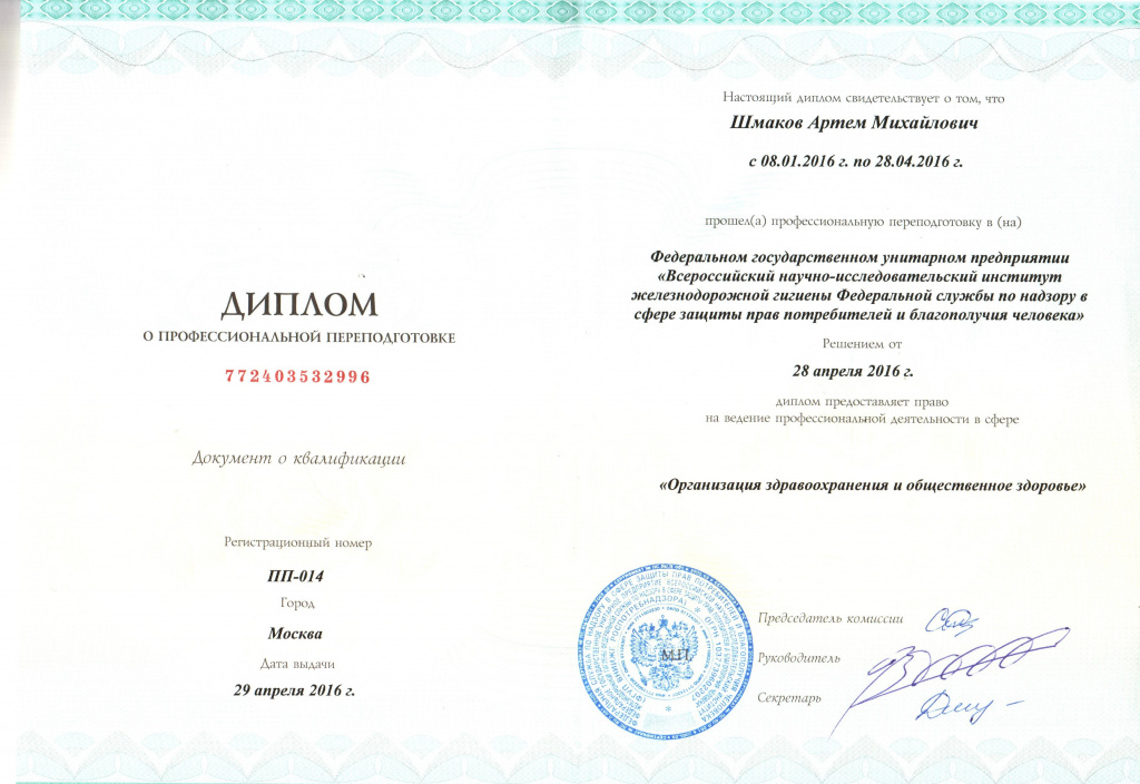 — Профессиональная переподготовка в ФГУП «Всероссийский научно-исследовательский институт железнодорожной гигиены Федеральной службы по надзору в сфере защиты прав потребителей и благополучия человека»  по специальности «Организация здравоохранения и общественное здоровье» 2016г.