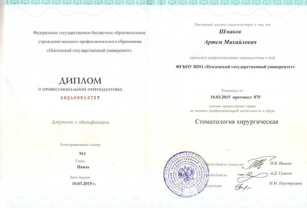 — Профессиональная переподготовка в ФГБОУ ВПО «Пензенский государственный университет» по специальности «Стоматология хирургическая» 2015г.