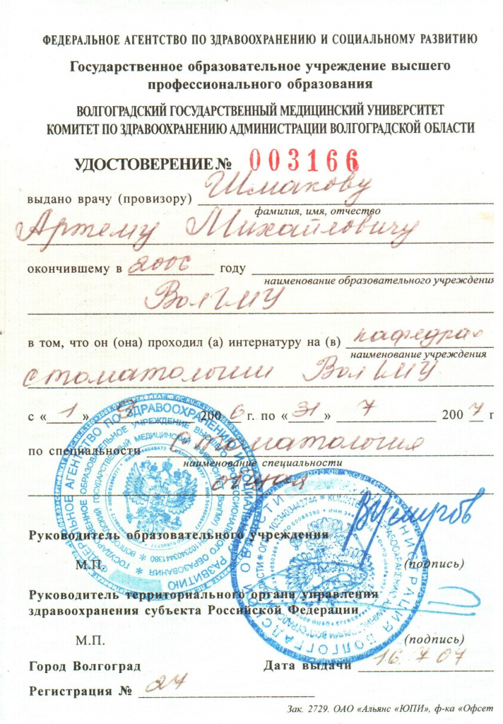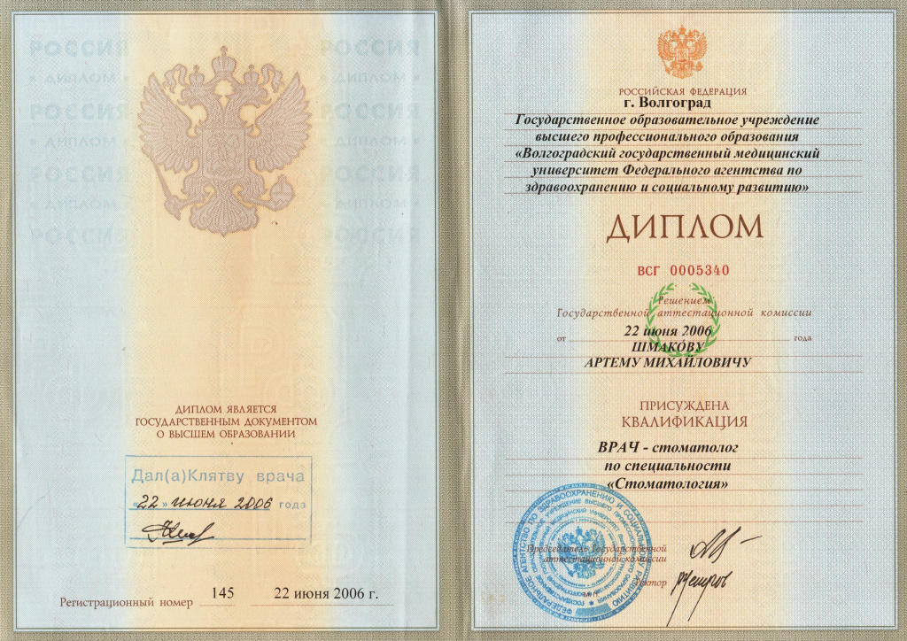 — Волгоградский государственный медицинский университет Федерального агентства по здравоохранению и социальному развитию по специальности «Стоматология» 2006 г.