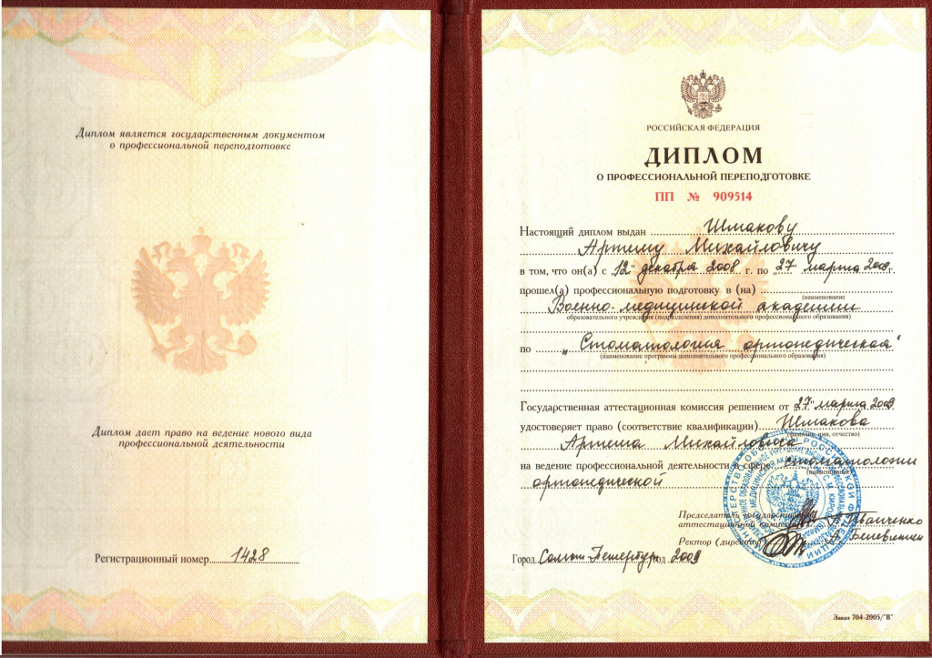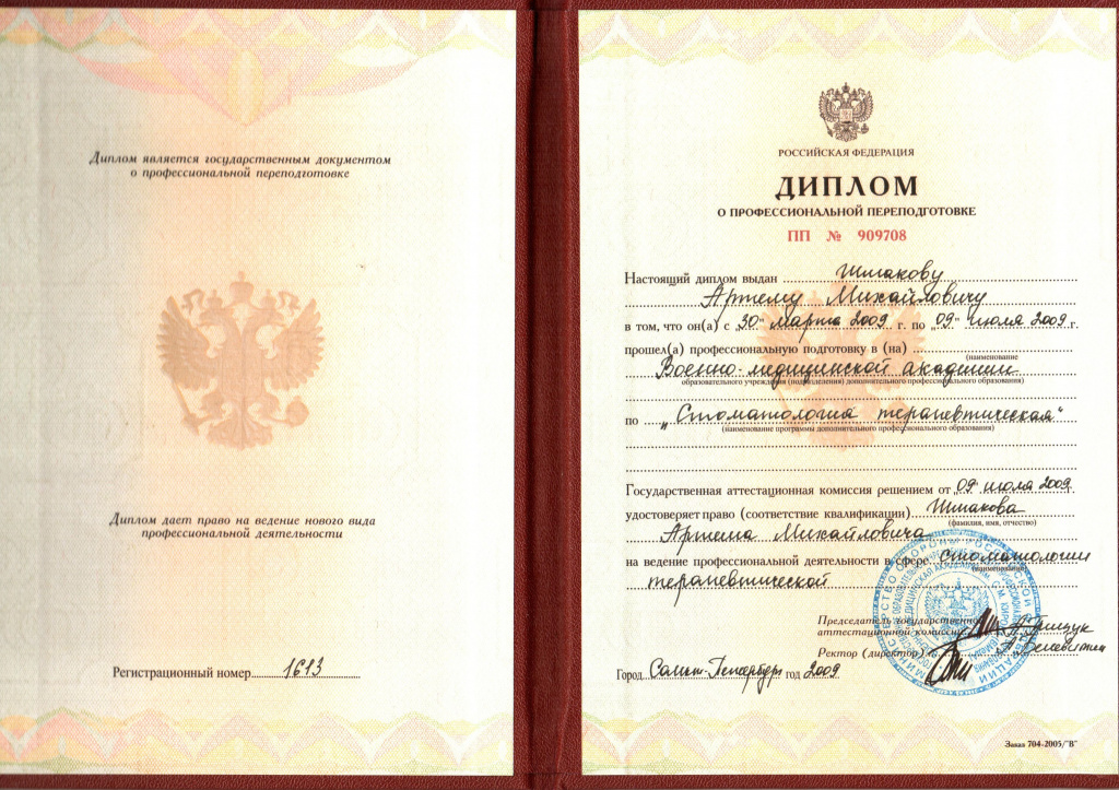 — Профессиональная подготовка в Военно-медицинской академии имени С.М. Кирова по специальности «Стоматология терапевтическая», «Стоматология ортопедическая» 2009г.