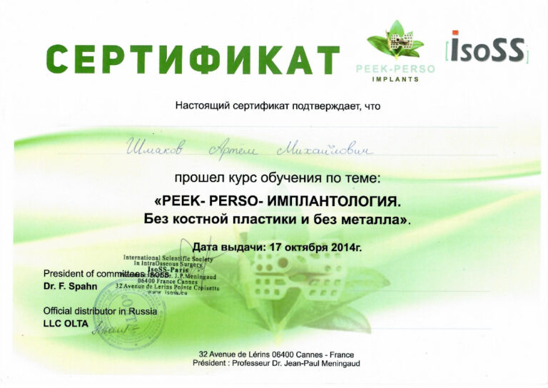 2014г. — » PEEK-Perso — Имплантология. Без костной пластики и без металла», Dr Frank-Pete Spahn, Франция;