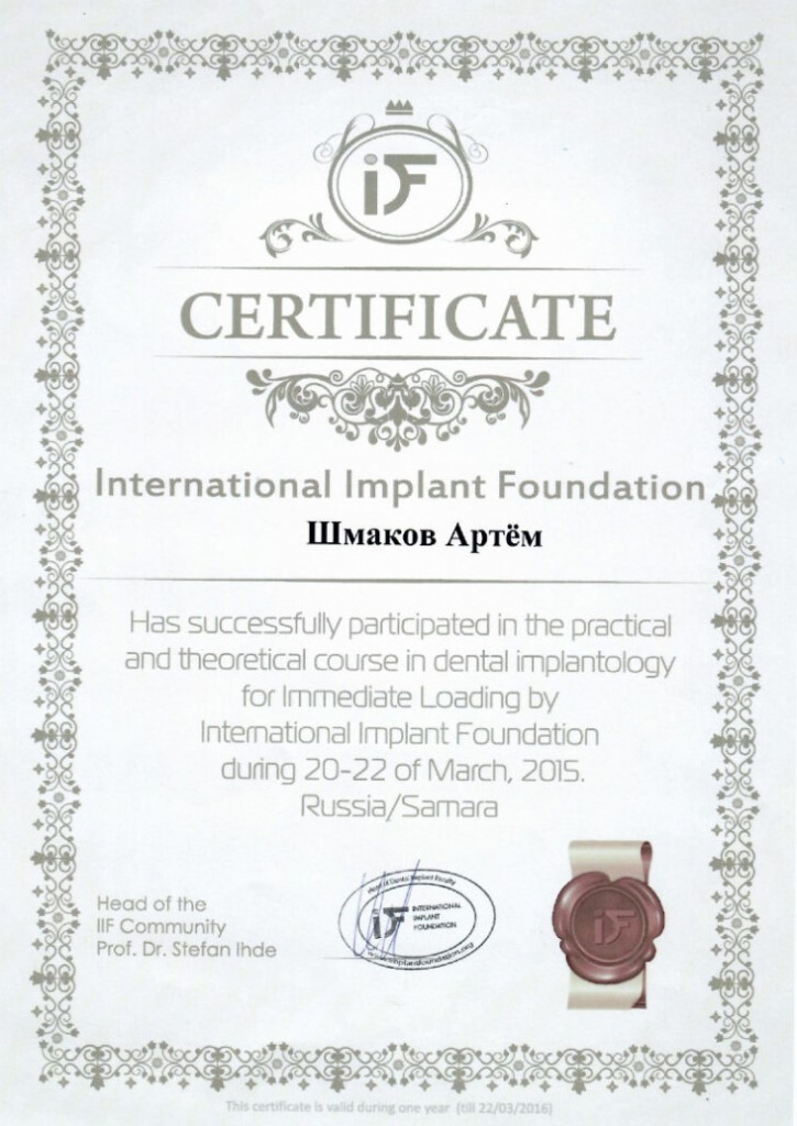2015г. — «Углубленный курс по базальной имплантации с немедленной нагрузкой Biomed», Россия;